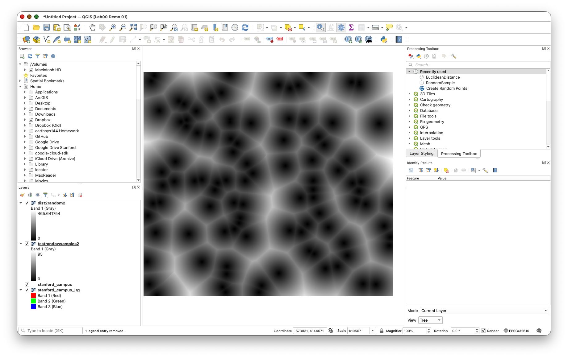 - If both tools complete successfully, WhiteboxTools is properly configured. You should see a raster layer showing the distance from each pixel to the nearest random sample point.