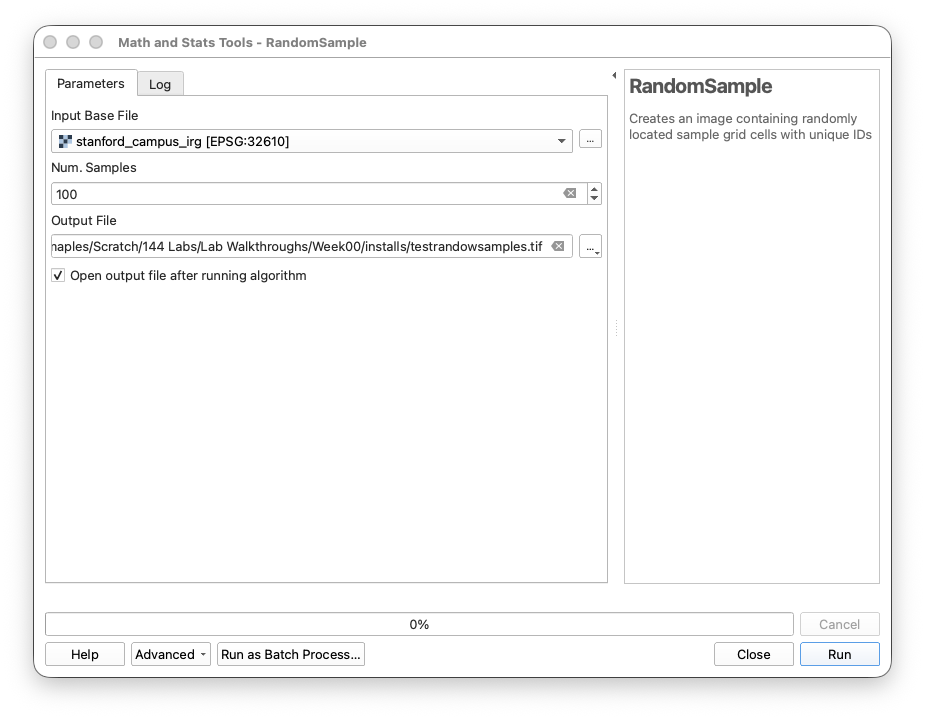 - Return to QGIS and retest the RandomSample tool