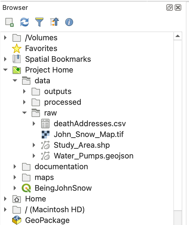 - John_Snow_Map.tif — A georeferenced image of the map from John Snow's original report on the cholera outbreak of 1854. Georeferencing means that real-world coordinates have already been assigned to this image, so QGIS knows exactly where on Earth it belongs.