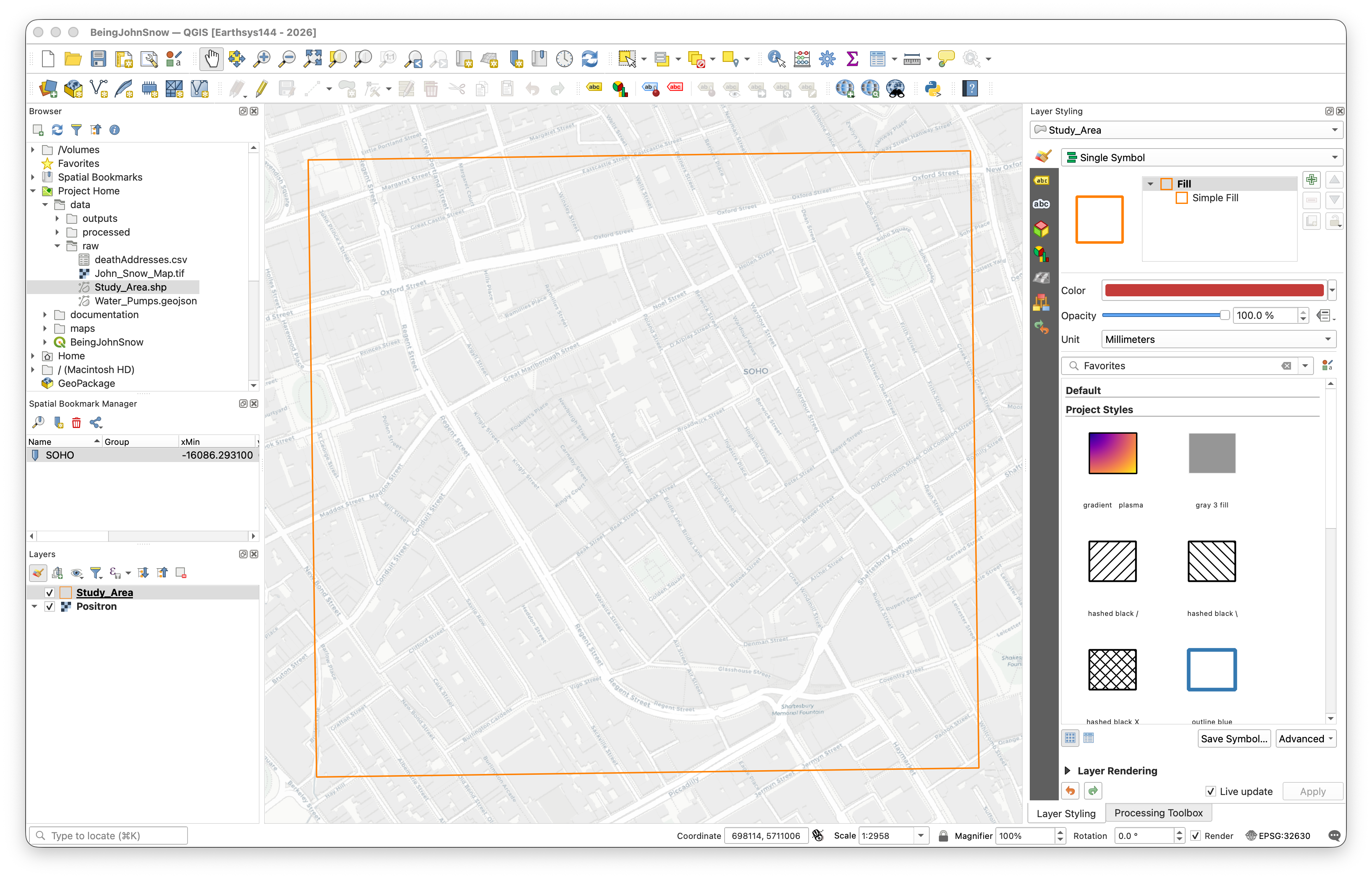 Now we'll add our first real data layer — a shapefile that defines our study area in the Soho neighborhood of London.