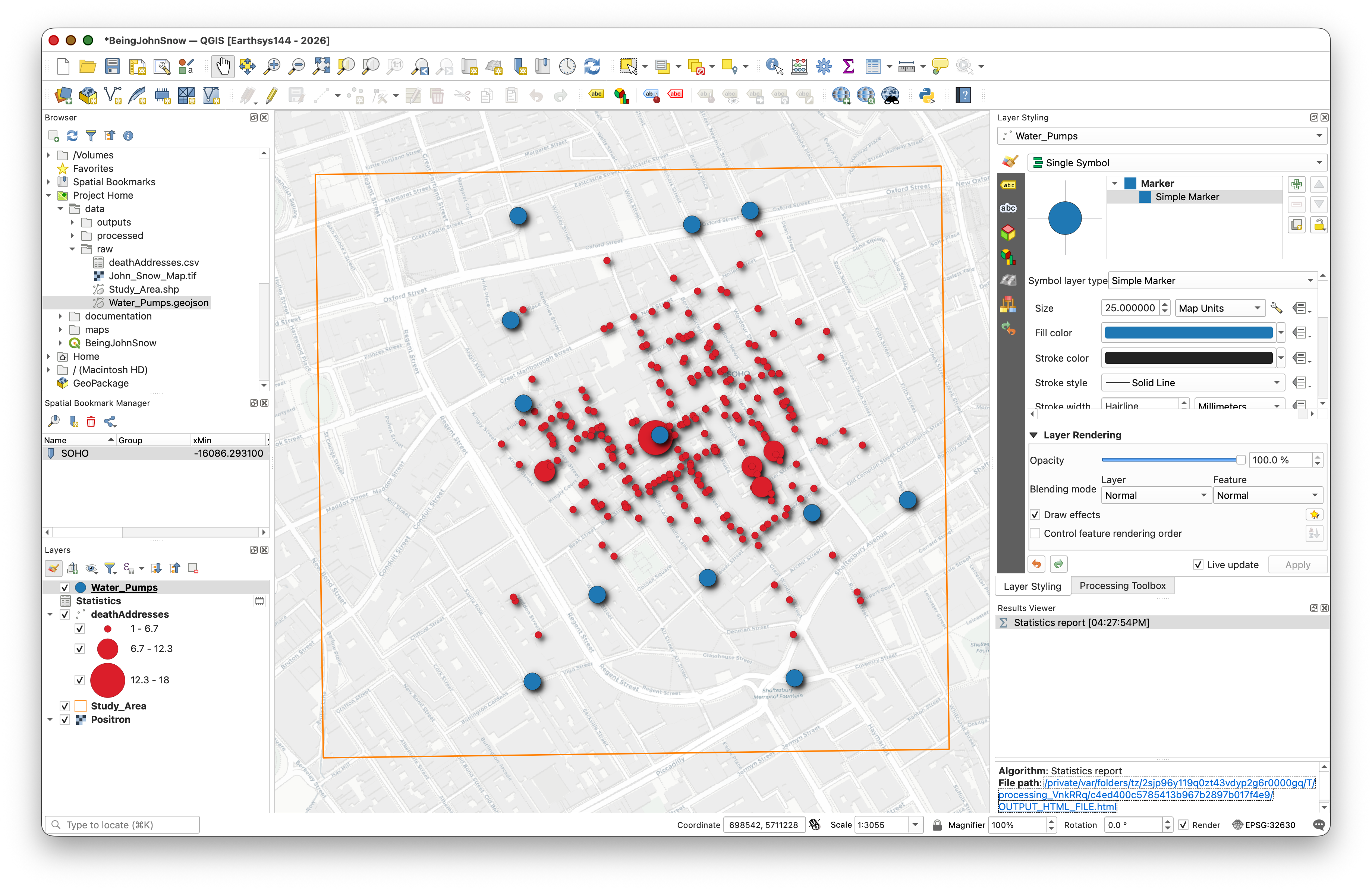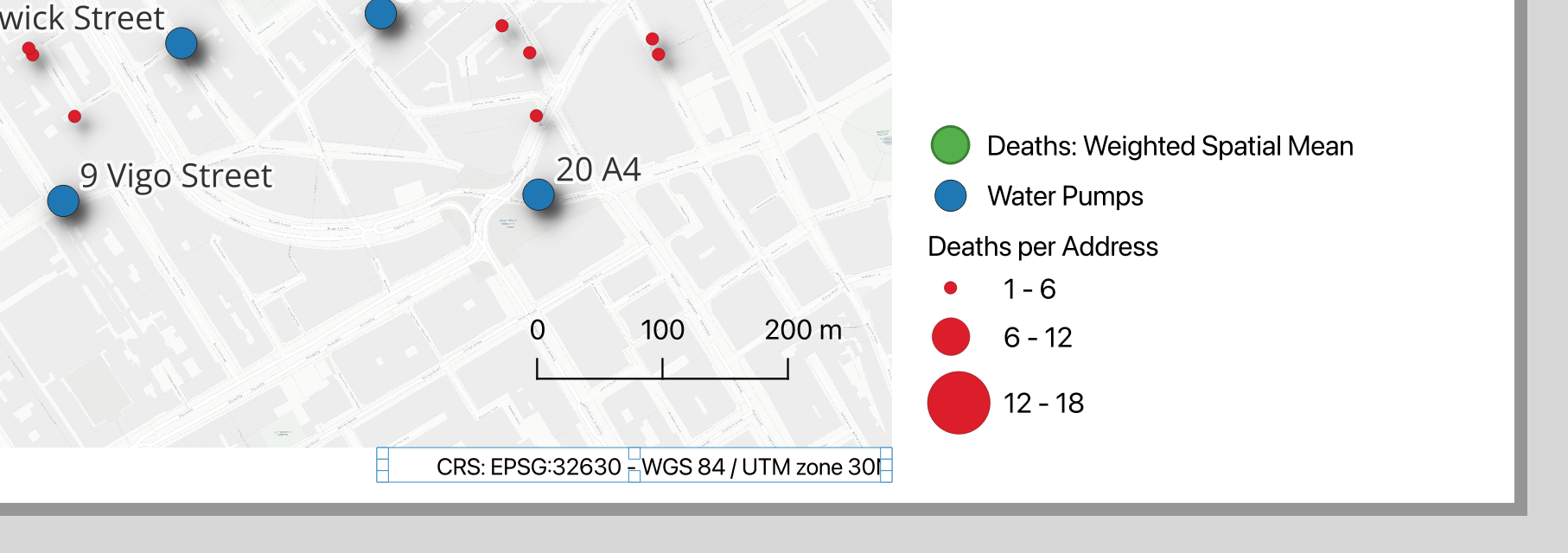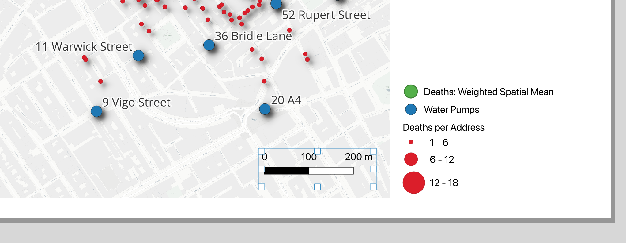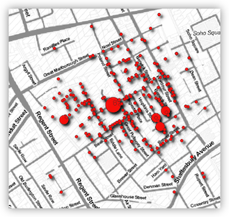 In this lab, you will retrace Snow's steps using modern GIS tools: plotting death addresses, mapping pump locations, and using spatial analysis to determine which pump was associated with the most deaths.