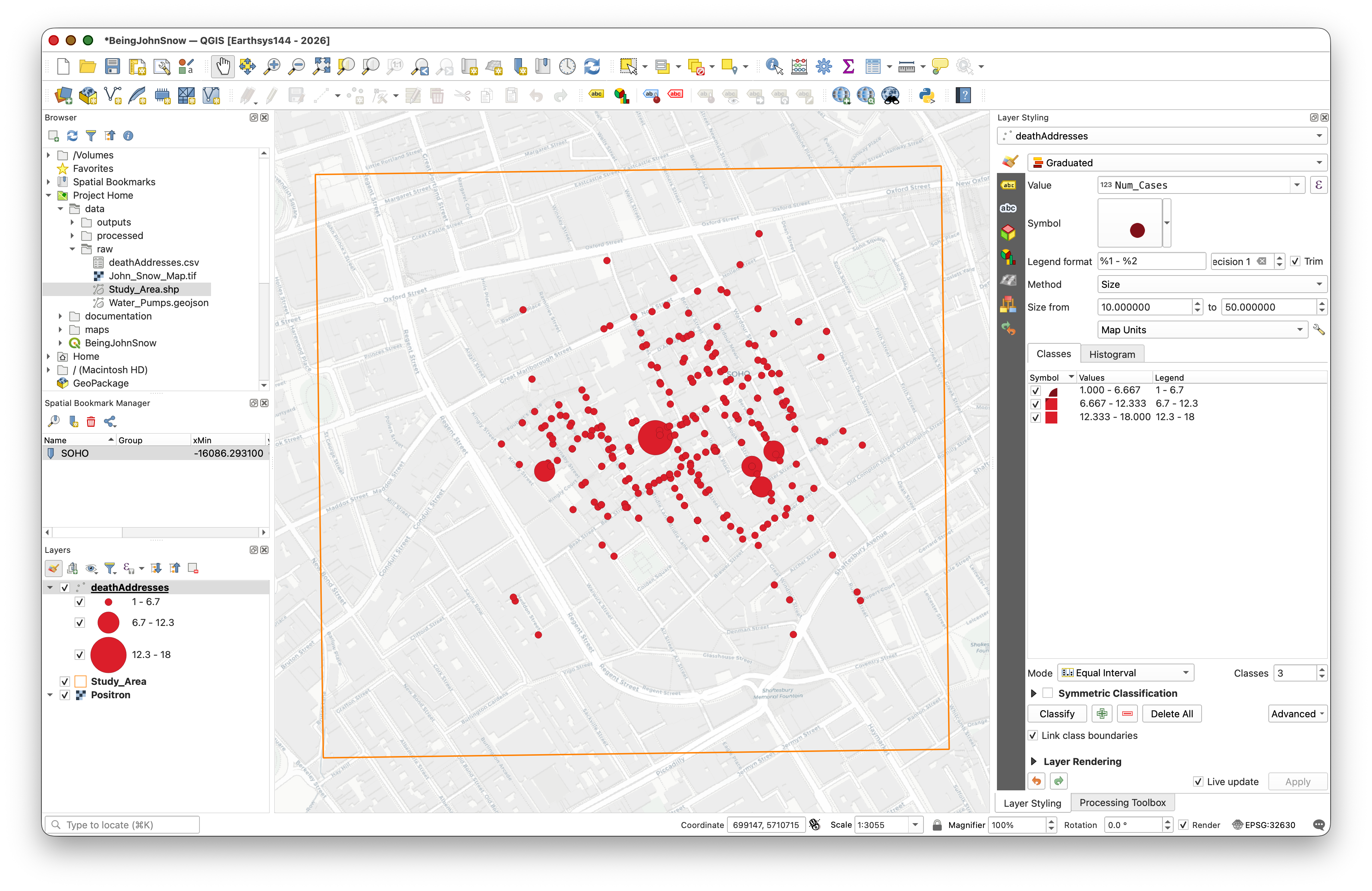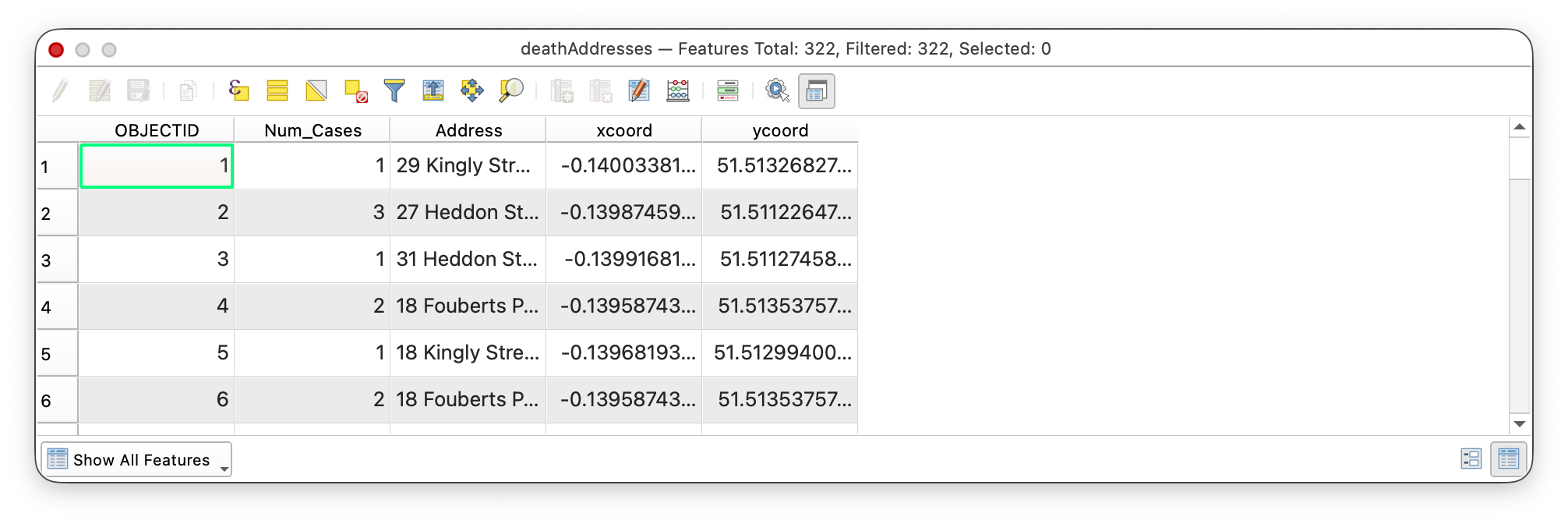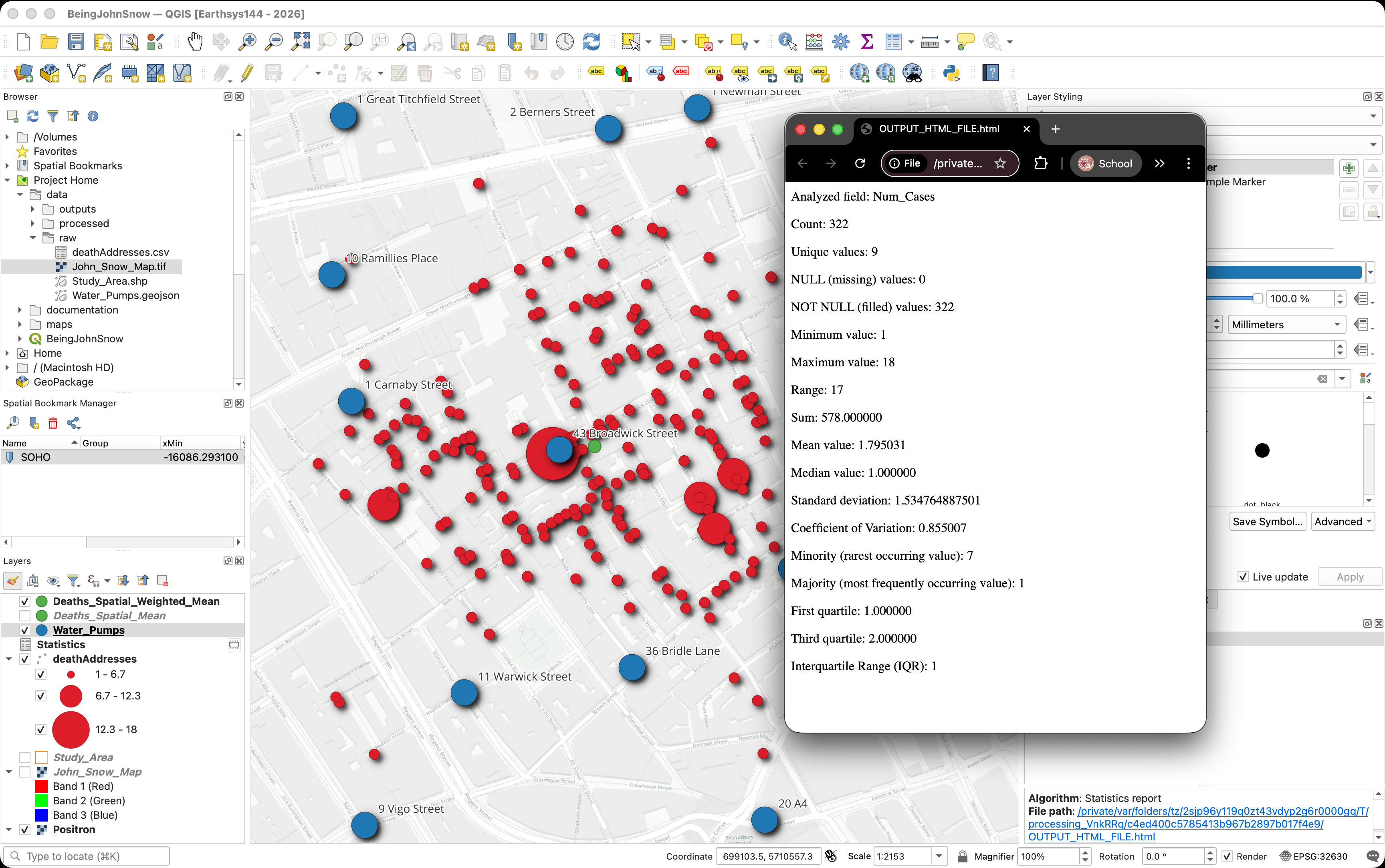 In this lab, you will retrace Snow's steps using modern GIS tools: plotting death addresses, mapping pump locations, and using spatial analysis to determine which pump was associated with the most deaths.