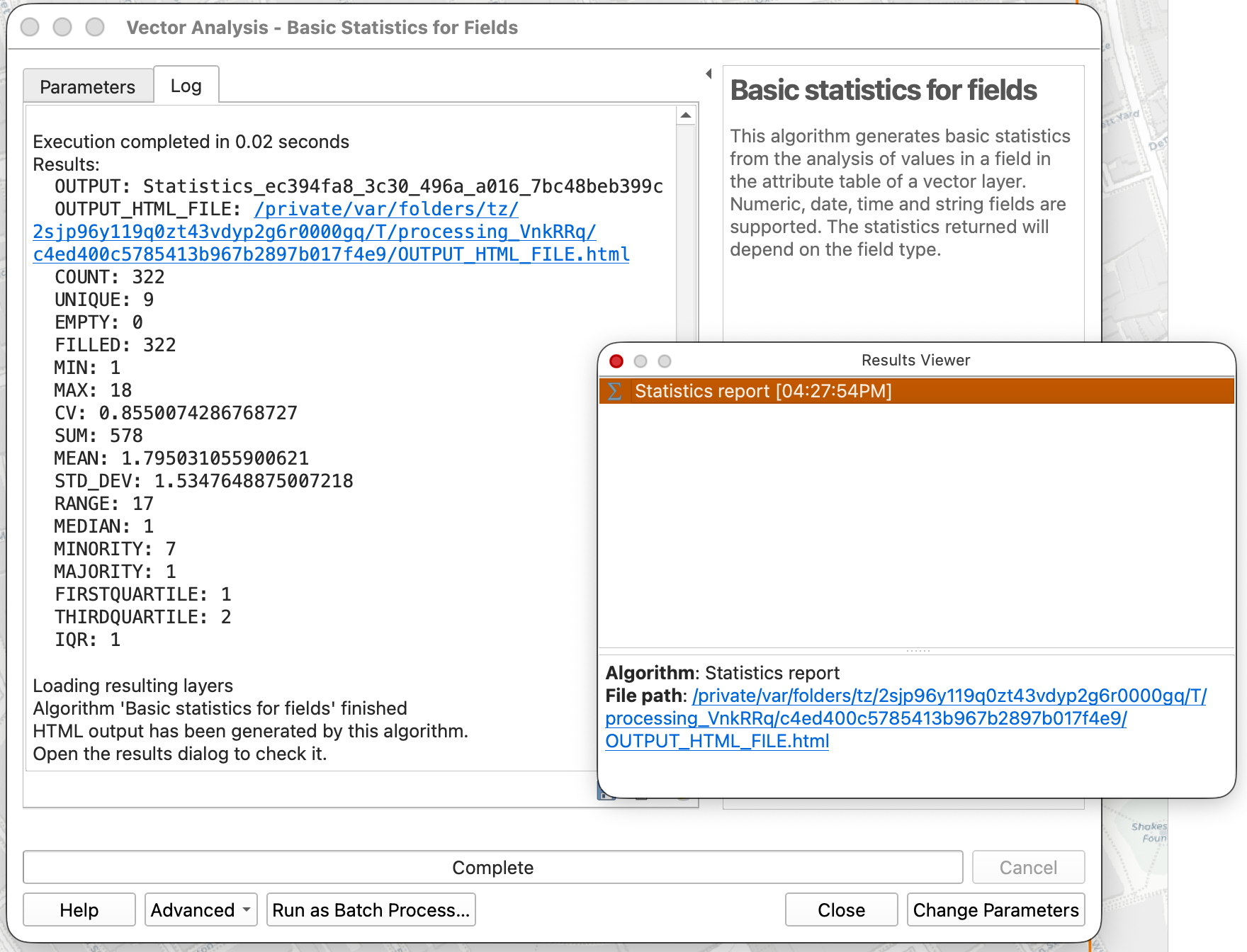 If needed, open the Results Viewer panel and click the hyperlink to the statistics summary report.
