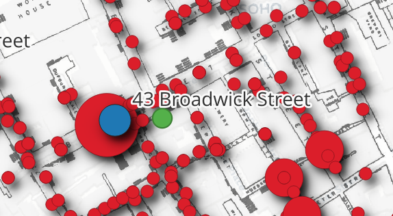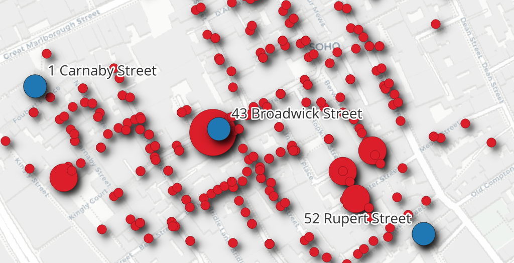 Snow began by doing something deceptively simple: he made a map. He went door to door in the Soho neighborhood, recording the address and number of deaths at each household. He then plotted these locations on a map of the neighborhood alongside the locations of the public water pumps that served the area. The spatial pattern was striking — the deaths clustered tightly around a single pump at the intersection of Broad Street and Cambridge Street (now Broadwick and Lexington Streets).