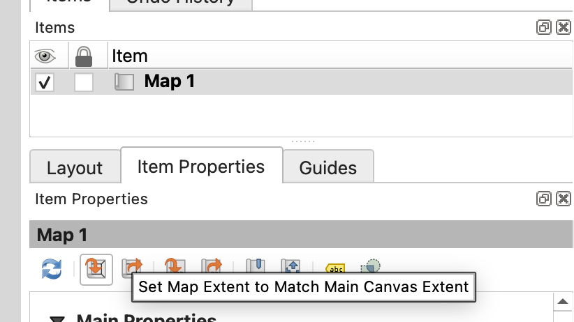 If needed, click the map frame to select it, then in the Item Properties panel click Set to map canvas extent so the layout matches the area you were viewing in the main QGIS window.