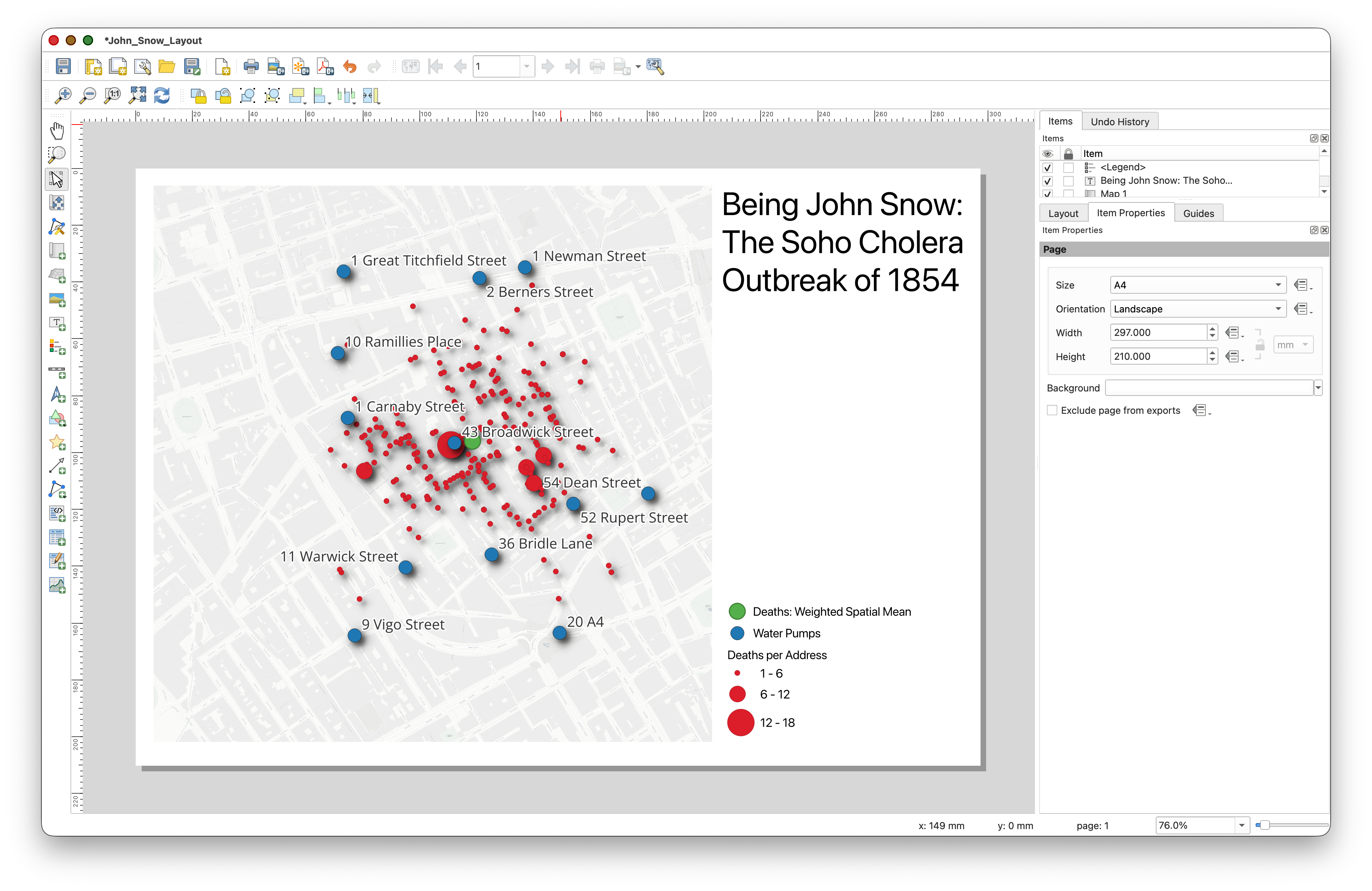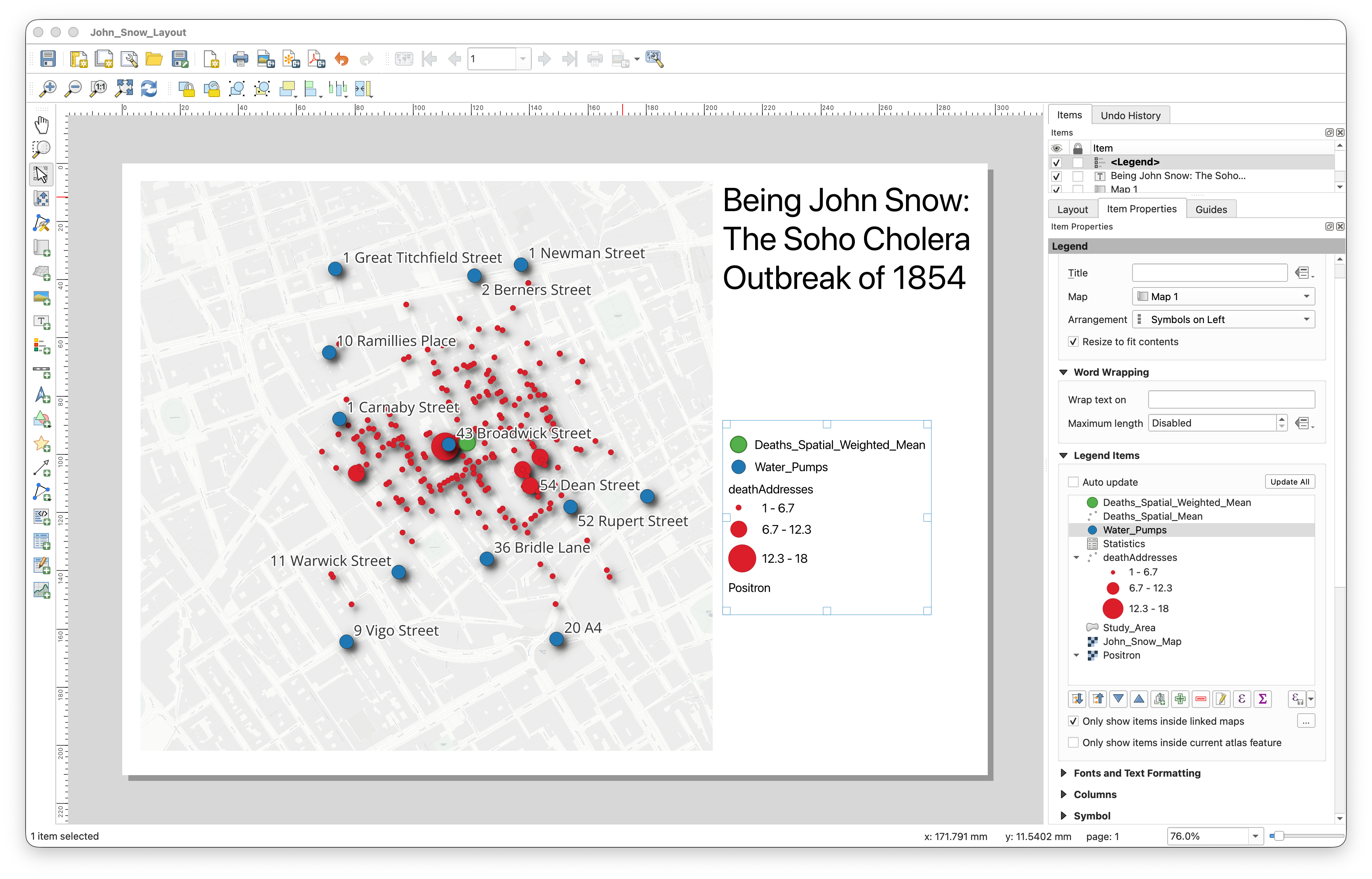 - If you want a cleaner, simpler final map, you can also turn off the visibility of the historic John_Snow_Map raster layer.
