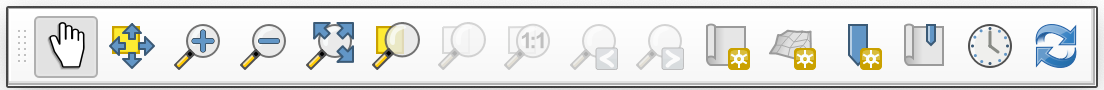 The Map Navigation Toolbar provides the main tools for moving around the Map Canvas. Take a moment to try each one: