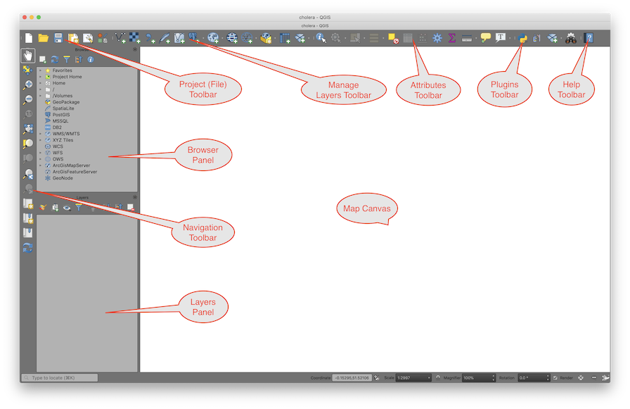 Here is a quick refresher on the three main parts of the QGIS interface: