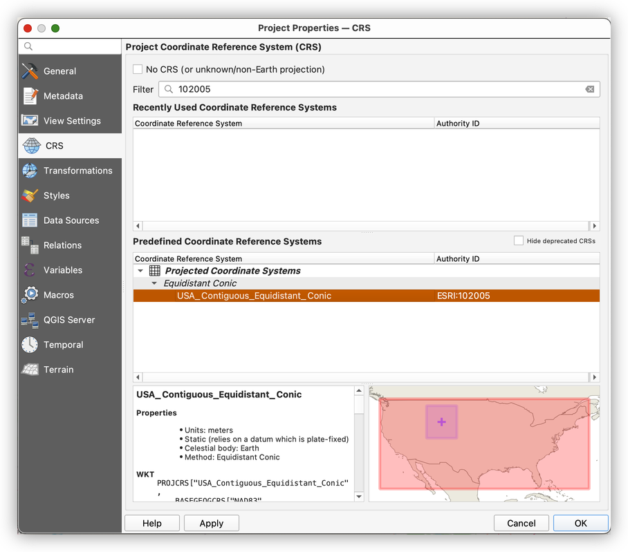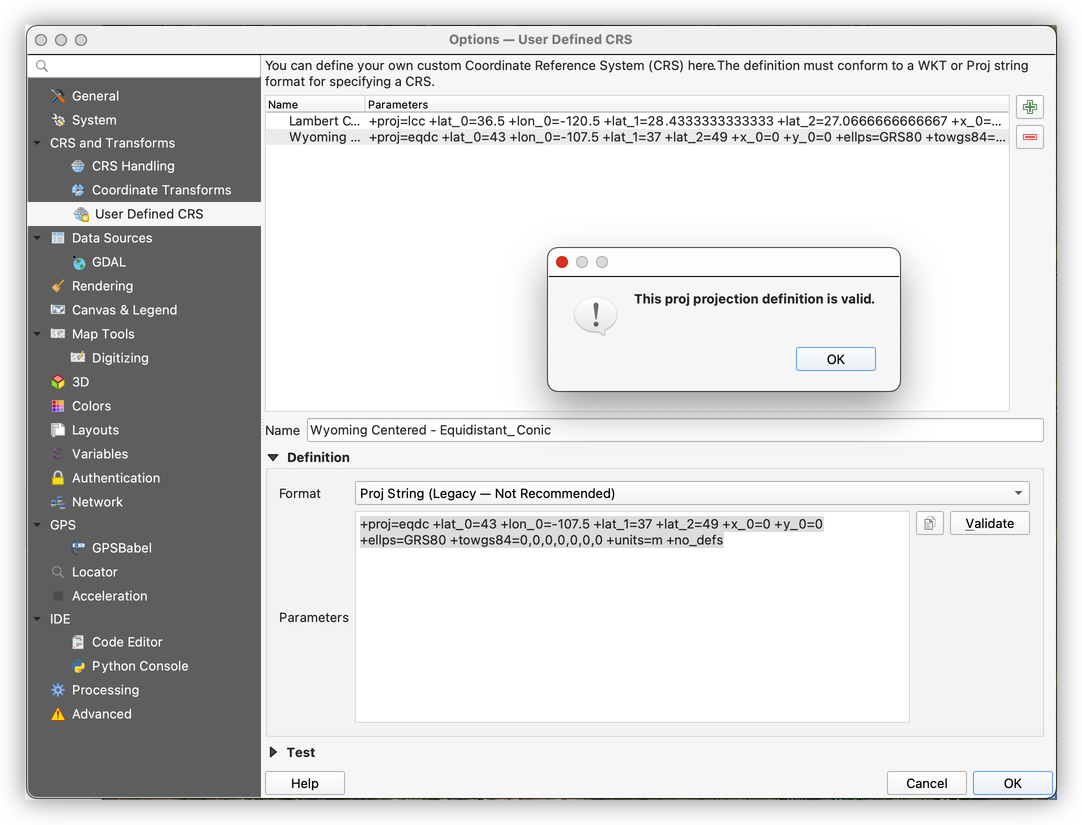 +proj=eqdc +lat_0=43 +lon_0=-107.5 +lat_1=37 +lat_2=49 +x_0=0 +y_0=0 +ellps=GRS80 +towgs84=0,0,0,0,0,0,0 +units=m +no_defsPaste the modified Proj4 text into the custom CRS definition.