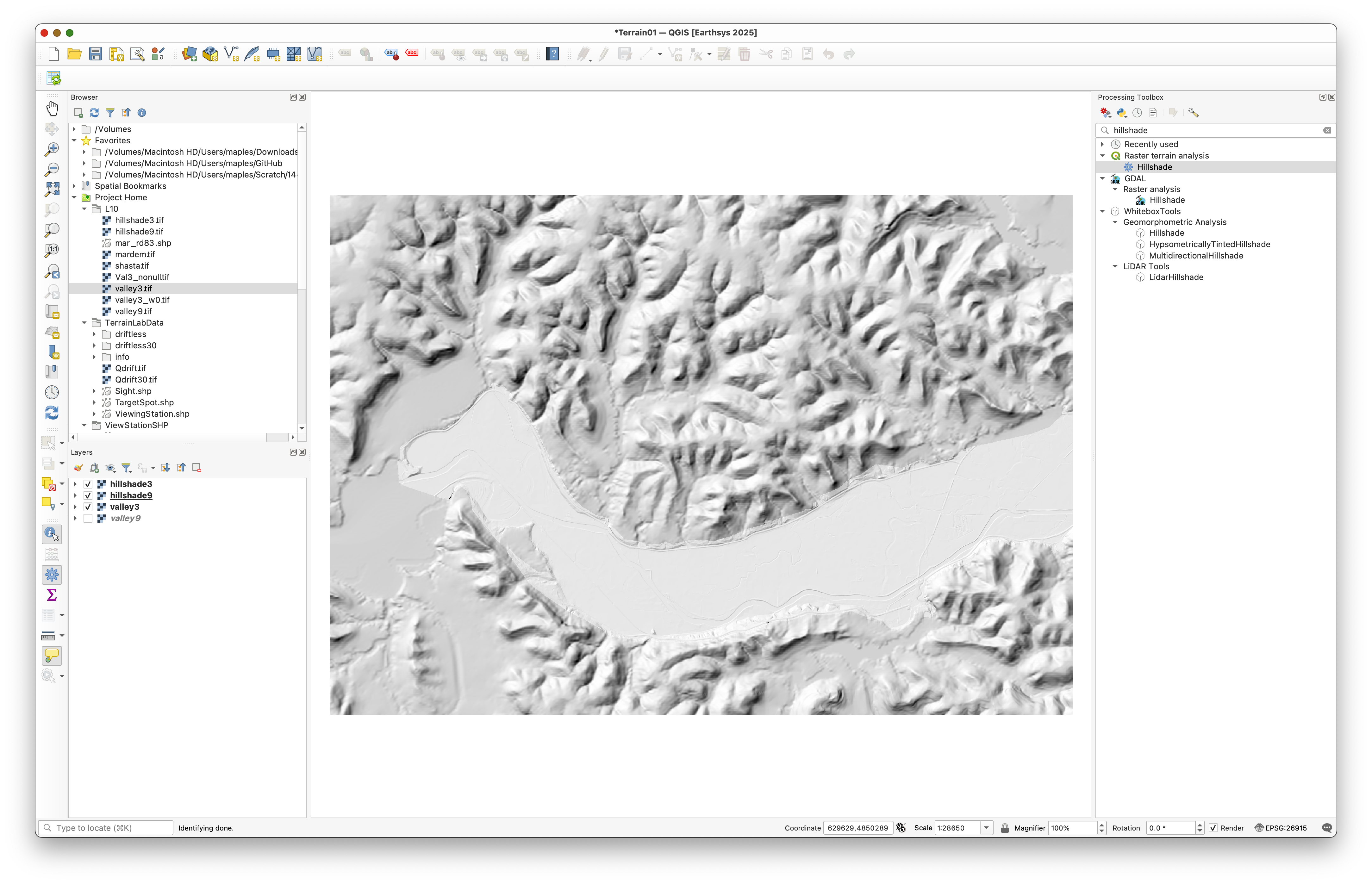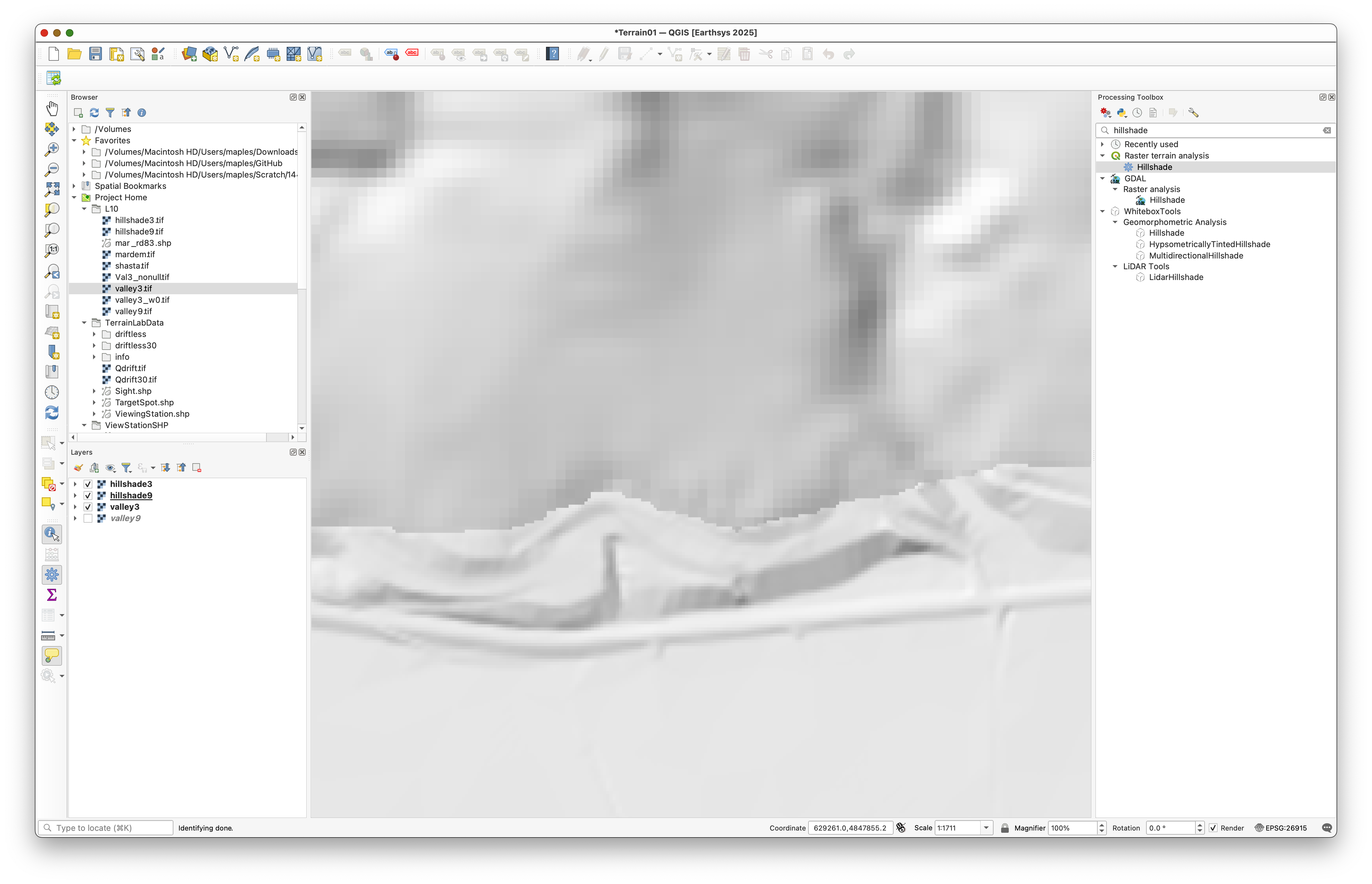- Open the Processing Toolbox and search for Hillshade.