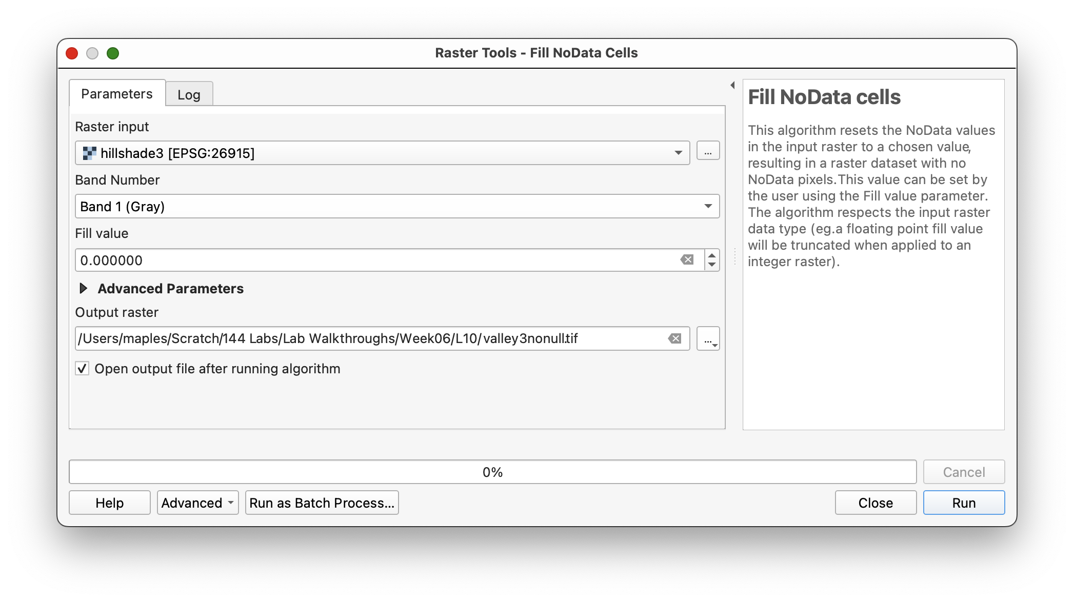 valley3as the input raster. - Set the fill value to