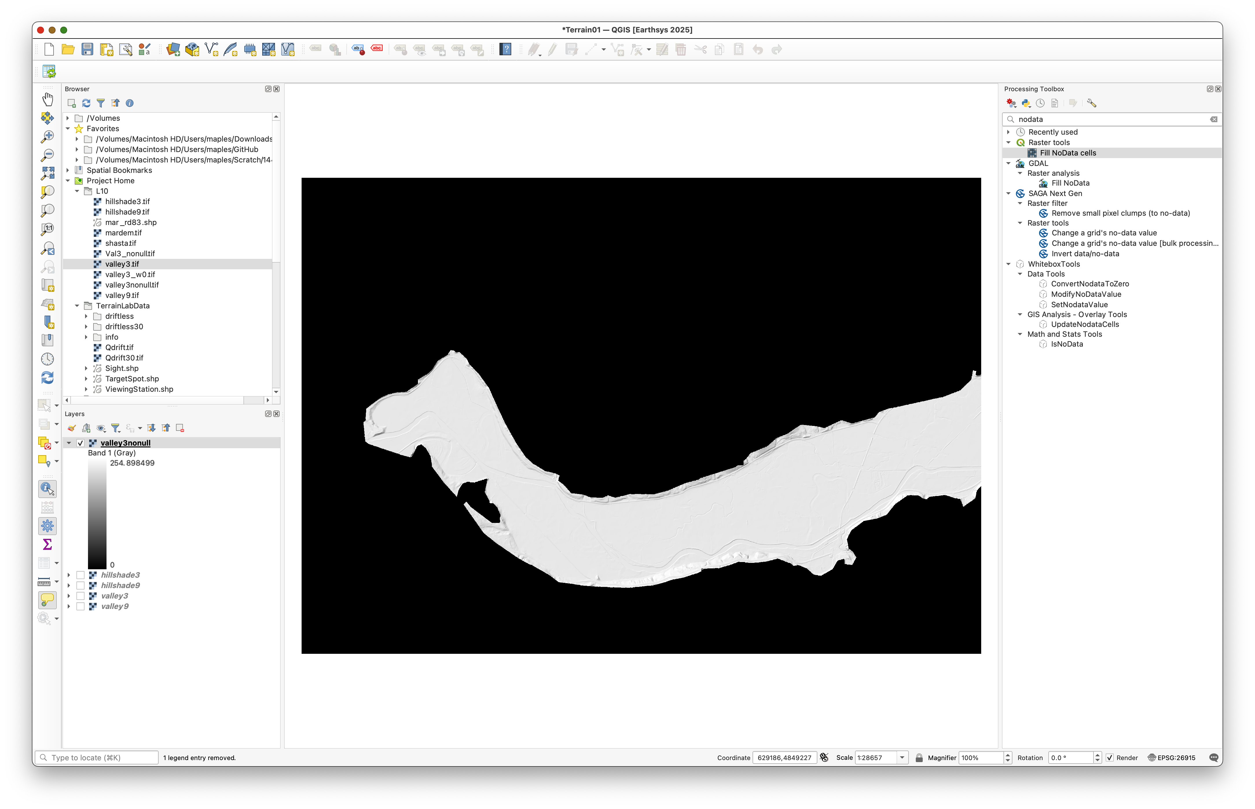 valley3raster. - Click both inside and outside the visible valley area to compare valid elevation cells with