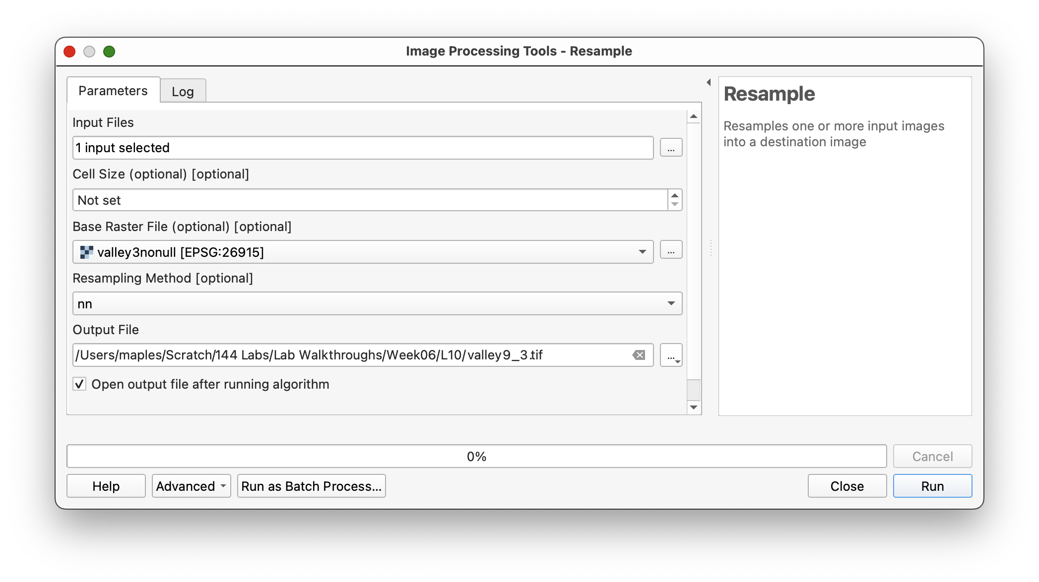 valley3nonullas the base raster or template layer. - Choose Nearest Neighbor as the resampling method.