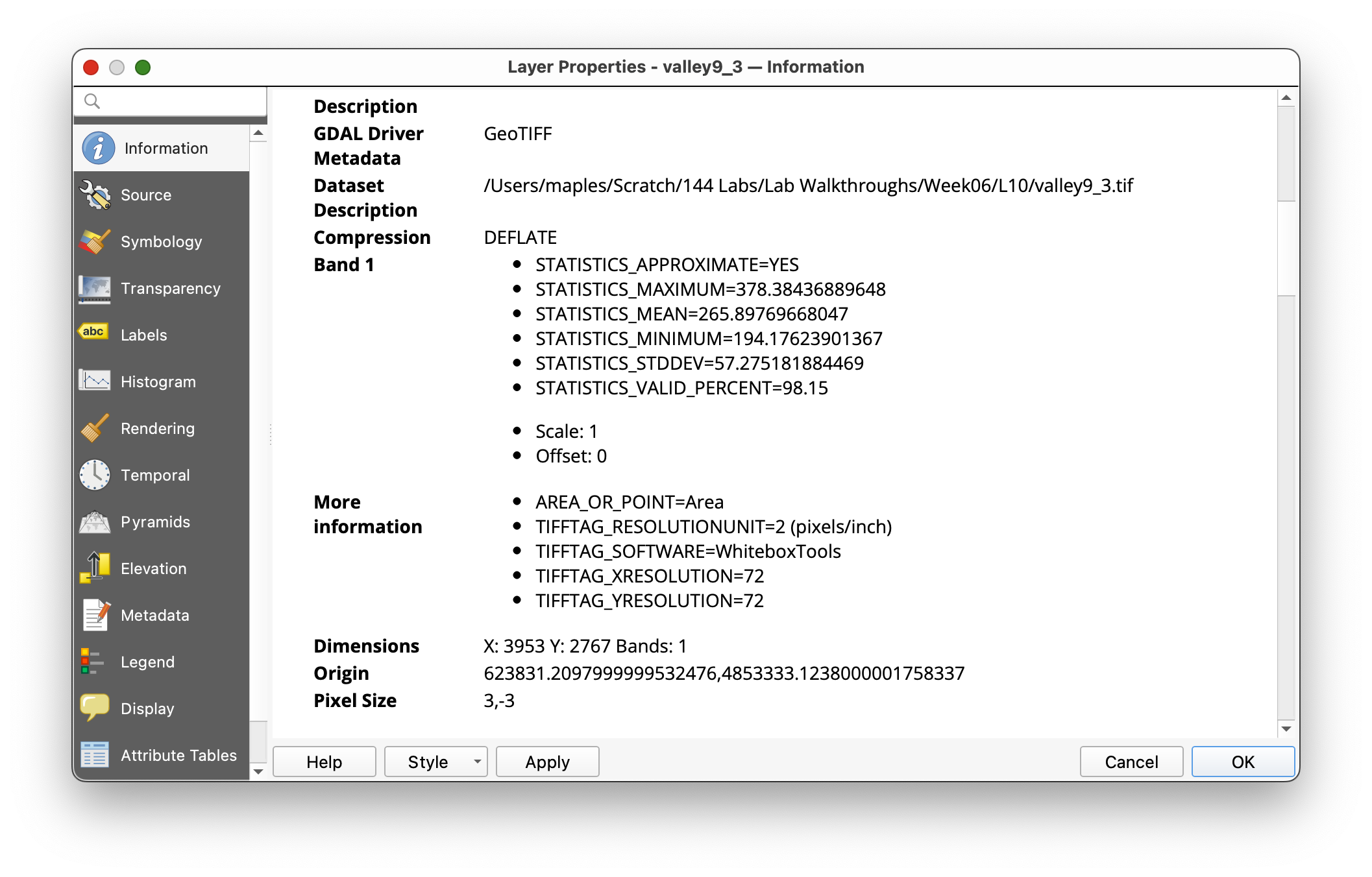 - Open Layer Properties > Information for the new raster and verify that the pixel size is