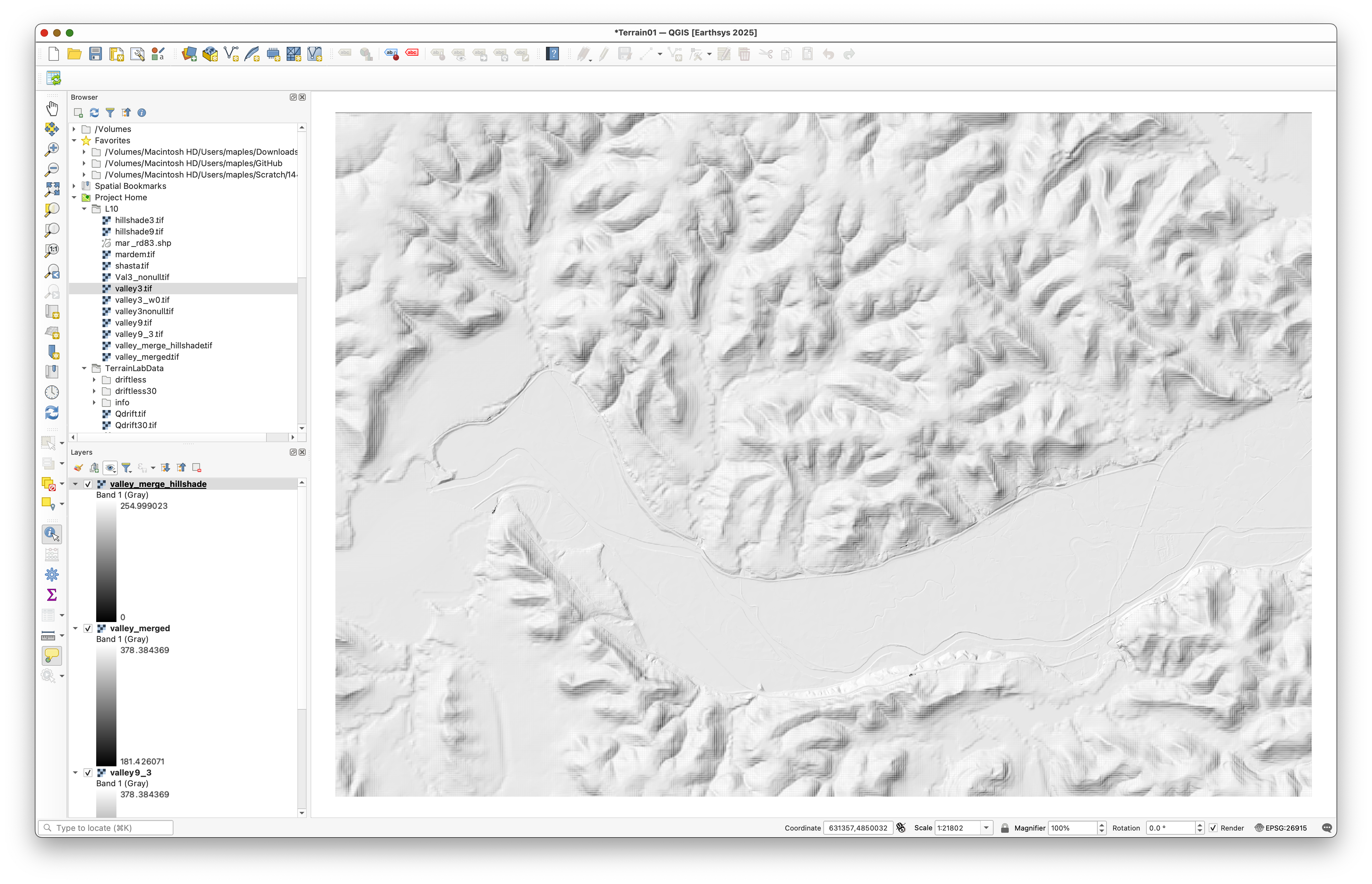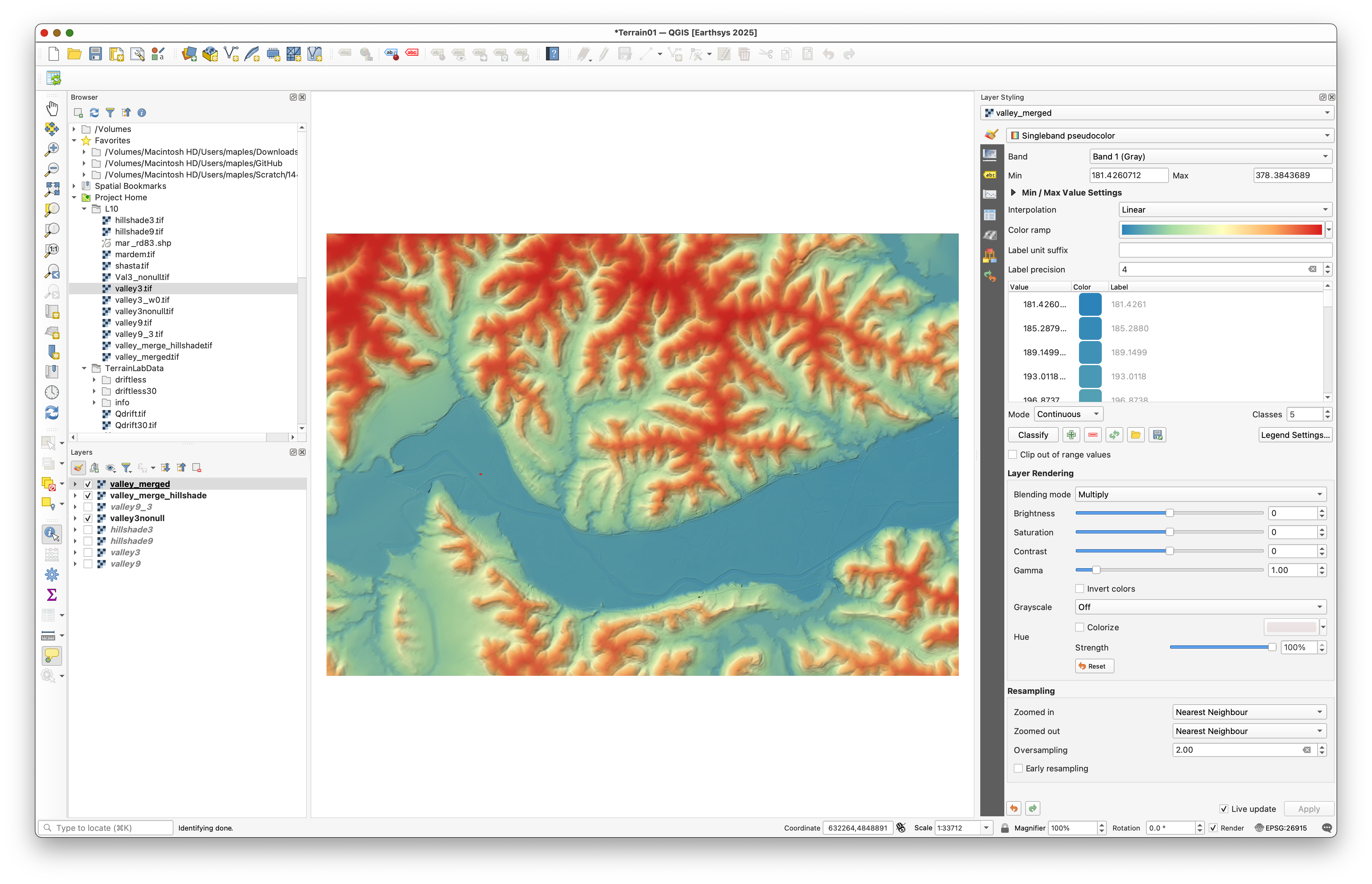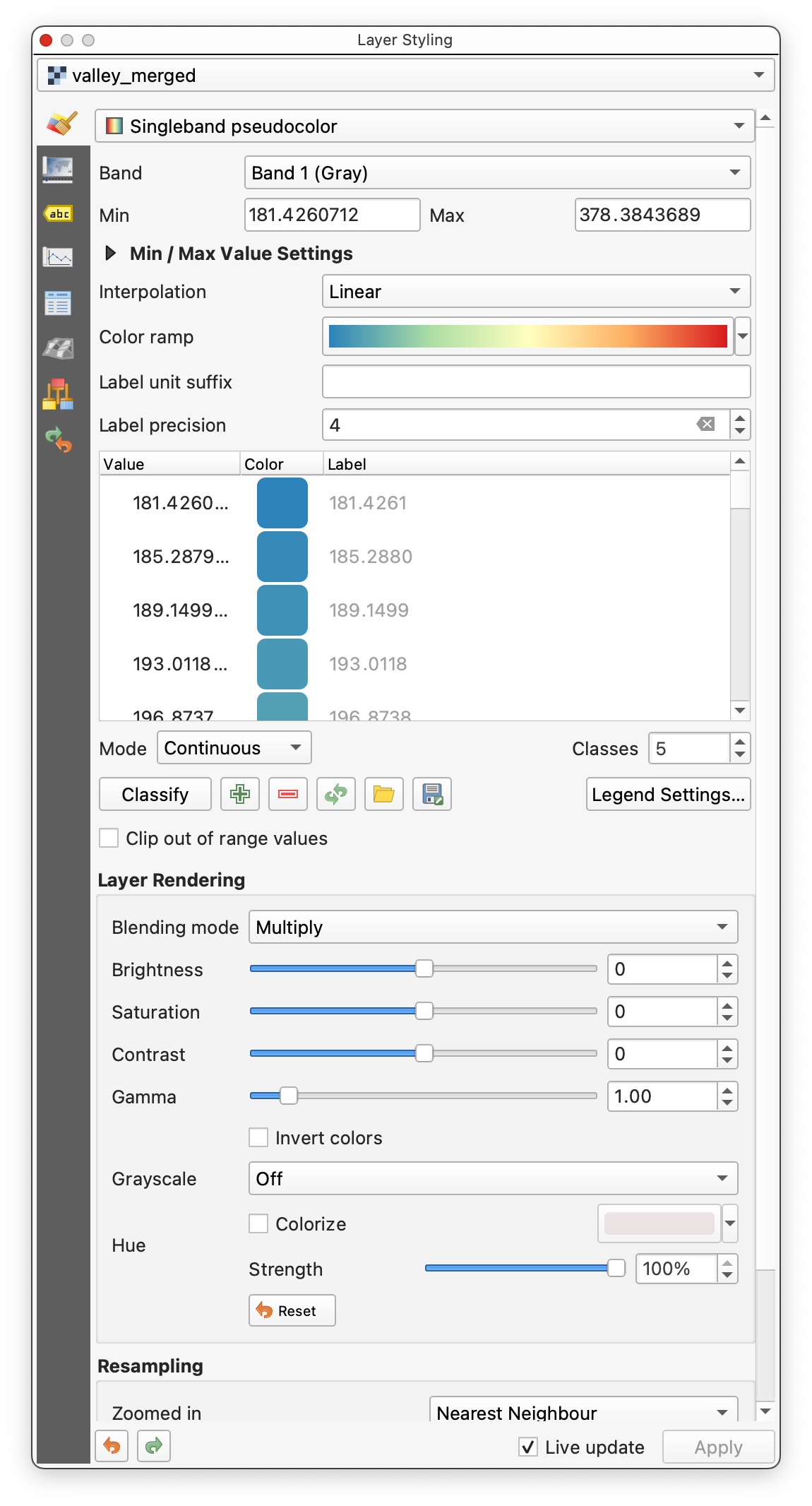 valley_mergedabove its hillshade layer. - Open the Layer Styling panel for