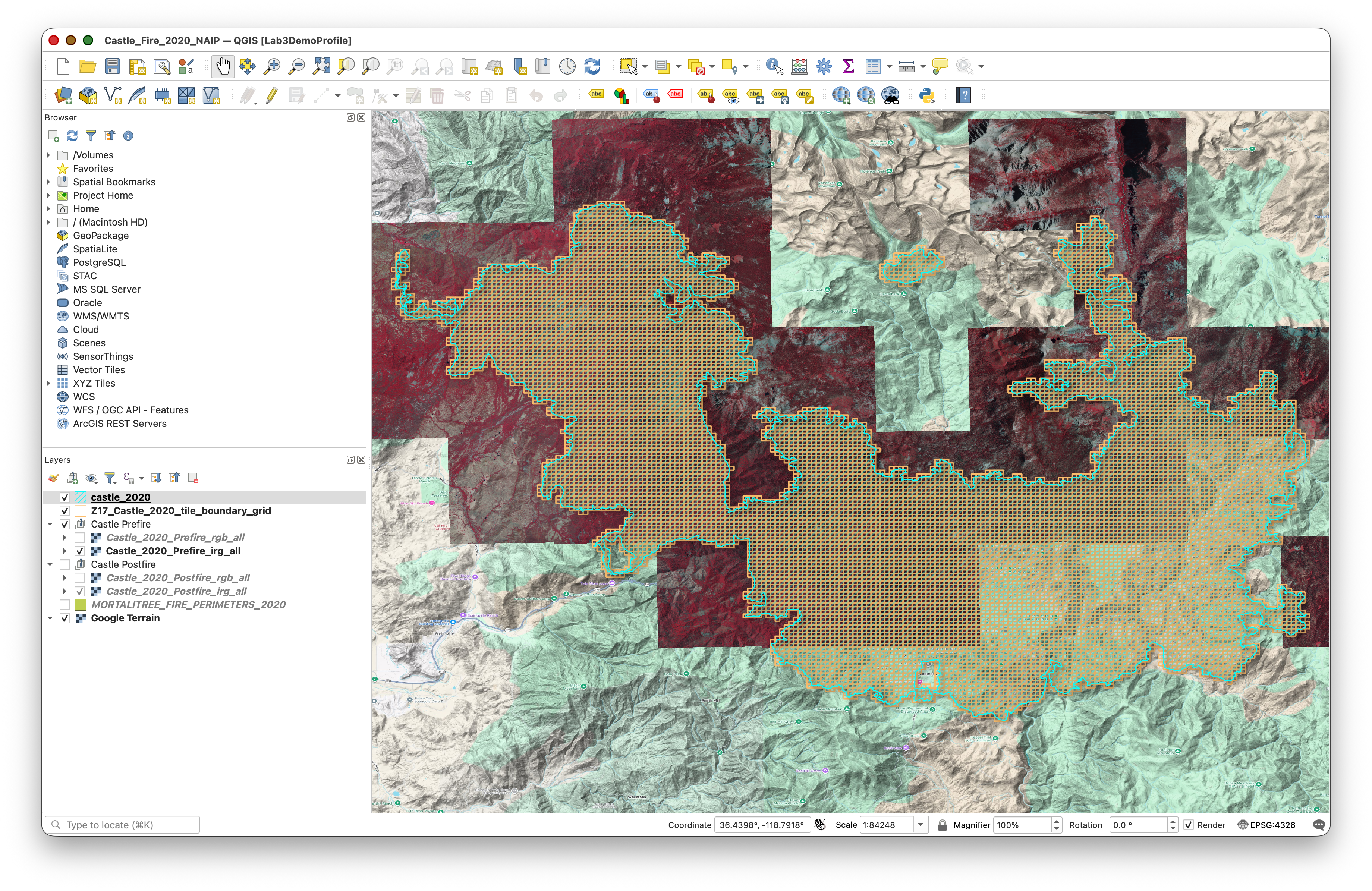 The project should load with the tile boundary grid, the study area outline, pre-fire and post-fire imagery groups, the 2020 fire perimeter layer, and the Google Terrain basemap visible in the Layers Panel. Everything is pre-configured and ready to use!