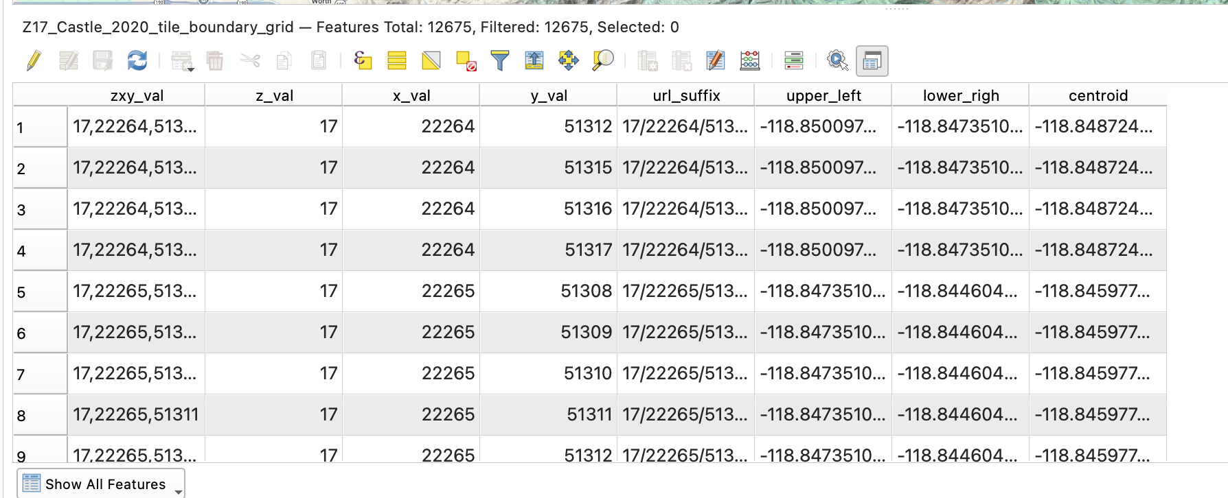- Columns contain attributes like tile coordinates (X, Y, Z)